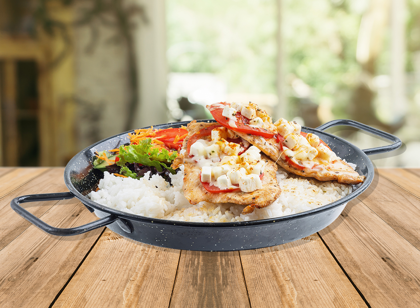 (Grilezett csirkemell görög fűszerezéssel, feta sajt, paradicsom, )