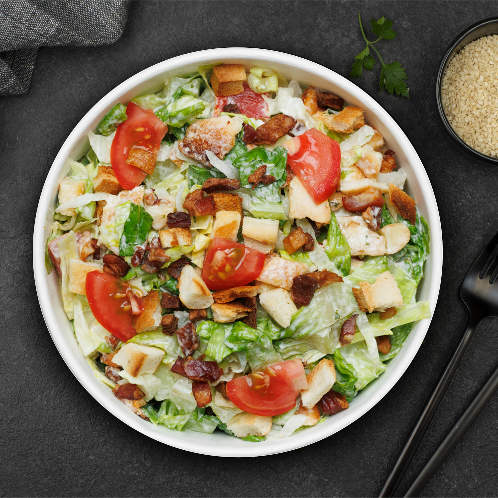 (jégsaláta, paradicsom, uborka, paprika, bacon, parmezán, cézár öntet)