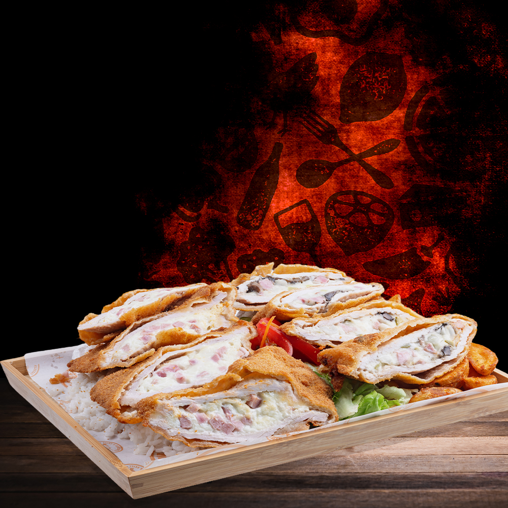 (sajttal-sonkával töltött szelet, séf kedvence töltött szelet, hasábburgonya, párolt rizs, friss saláta, )