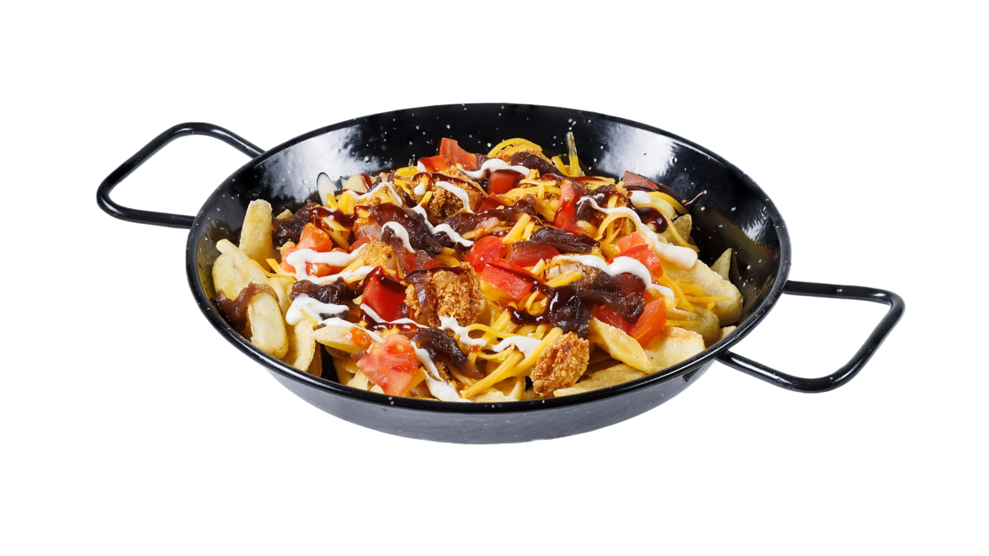 (Csónakburgonya, Kentucky csirkemell, American Cheddar Cheese, paradicsom kocka, lilahagymalekvár, BBQ szósz, Garlic-parmesan szósz)