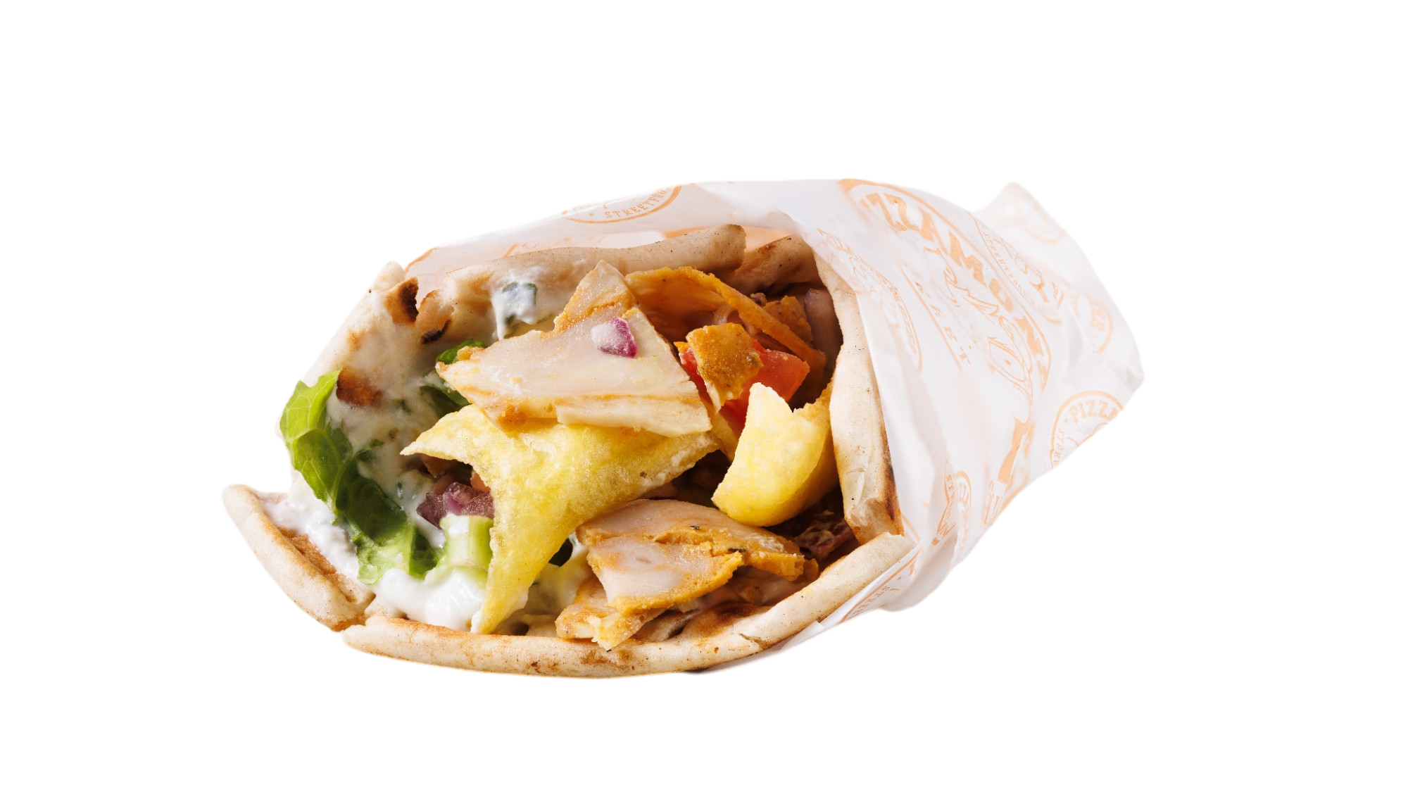(Fűszerezett gyros hús, sült burgonya, saláta, lilahagyma, paradicsom, tzatziki, házi lepény)