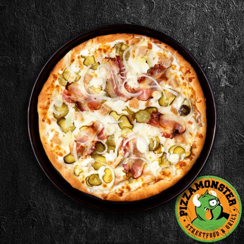 (tejfölös alap, bacon, csirkemell, hagyma, csemege uborka, mozzarella, juhtúró)