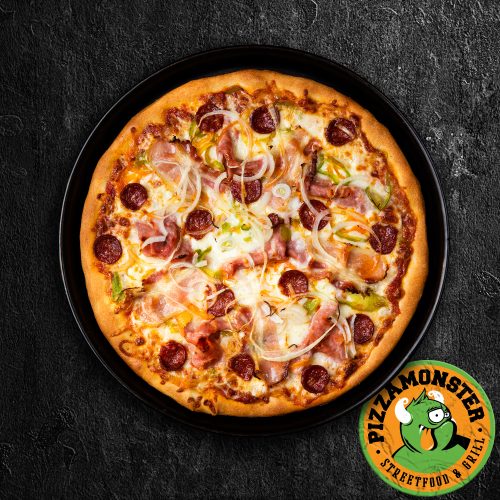 (csípős-paradicsomos alap, kolbász, sonka, bacon, hagyma, erős paprika, mozzarella)